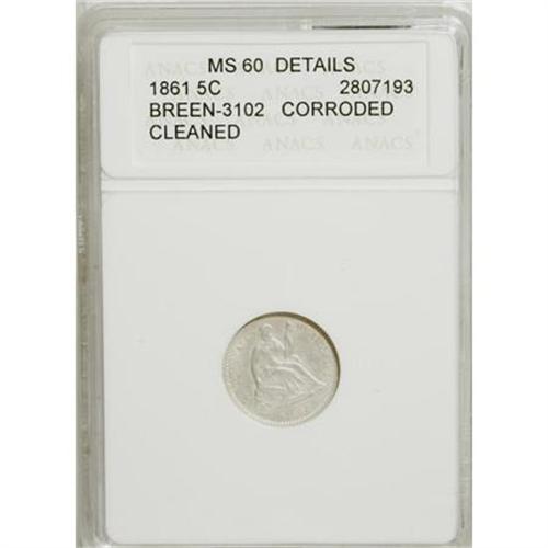 <B>1861/0 H10C --Cleaned, Corroded--ANACS. MS60 Details.</B></I> Breen-3102. NGC Census: (1/384). PCGS Population (10/289). Mintage: 3,361,000. Numismedia Wsl. Price for NGC/PCGS coin in MS60: $115. (#4379)<BR><BR><B>Coin Engraver:</B> Christian Gobrecht<BR><BR><b>Shipping:</b> Coins & Currency (<a target="_blank" href="http://www.heritageauctions.com/common/shipping.php">view shipping information</a>)