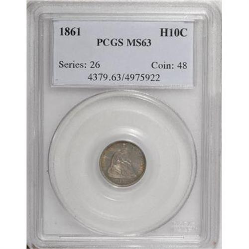 <B>1861 H10C MS63 PCGS.</B></I> PCGS Population (73/149). NGC Census: (101/213). Mintage: 3,361,000. Numismedia Wsl. Price for NGC/PCGS coin in MS63: $200. (#4379)<BR><BR><B>Coin Engraver:</B> Christian Gobrecht<BR><BR><b>Shipping:</b> Coins & Currency (<a target="_blank" href="http://www.heritageauctions.com/common/shipping.php">view shipping information</a>)