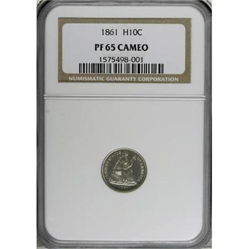 <B>1861 H10C PR65 Cameo NGC.</B></I> Frosted, sharply struck motifs stand out against the deeply mirrored fields, all of which are covered in a barely discernible layer of white-champagne color. Both faces are impeccably preserved, further enhancing the coin's outstanding eye appeal. NGC and PCGS have certified only nine Cameos out of the 1,000 piece mintage. Census: 1 in 65 Cameo, 1 finer (7/07).<BR><BR><b>Shipping:</b> Coins & Currency (<a target="_blank" href="http://www.heritageauctions.com/common/shipping.php">view shipping information</a>)