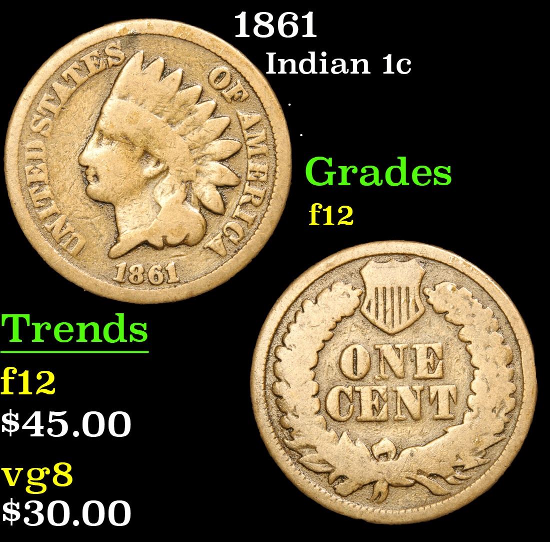 1861 Indian Cent 1c Grades f, fine. Key Date. According to David Hall, The 1861 is the lowest mintage of the 1860-64 copper-nickel Indian cents. It is the rarest copper-nickel Indian cent in circulated grades."