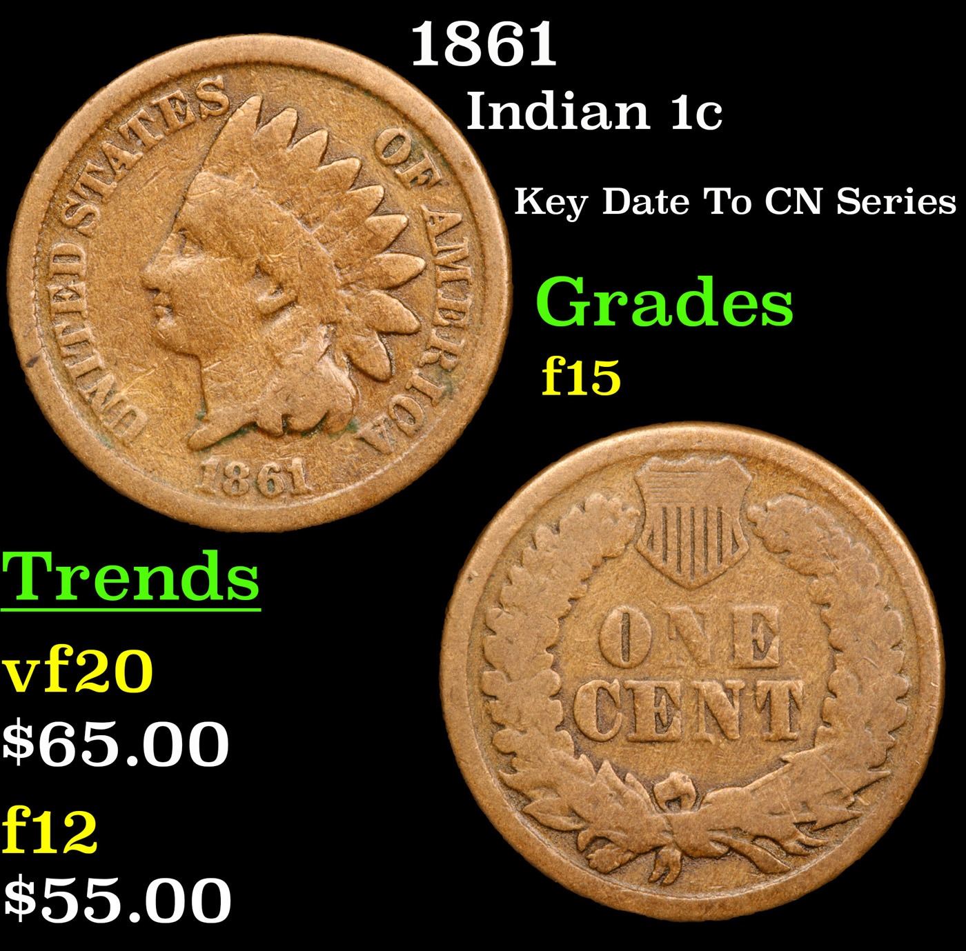 1861 Indian Cent 1c Grades f+. Key Date. According to David Hall, The 1861 is the lowest mintage of the 1860-64 copper-nickel Indian cents. It is the rarest copper-nickel Indian cent in circulated grades."