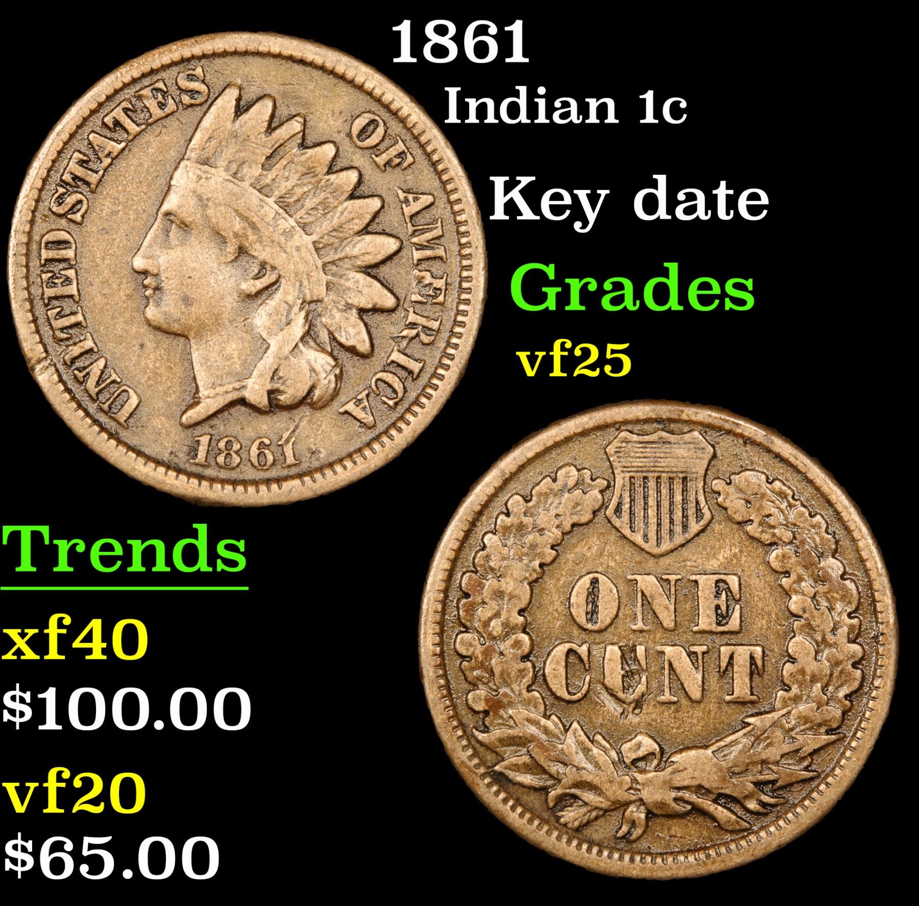 1861 Indian Cent 1c Grades vf+. Key Date. According to David Hall, The 1861 is the lowest mintage of the 1860-64 copper-nickel Indian cents. It is the rarest copper-nickel Indian cent in circulated grades." Key date