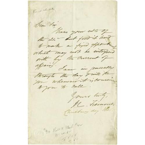 <B>1861 John C. Frémont Autograph Letter Signed</B></I> “<I>J. C. Frémont</B></I>”. One page, 5.5” x 9”, December 25 1861, soiled with a couple of small splits in the folds, else very good condition. At the time this letter was written Frémont had just been relieved of his command of the Department of the West by Lincoln. Frémont's meddling in the affairs of Missouri caused Lincoln to worry that it, and possibly other neutral states, might cause them to lean towards the Southern cause. The short letter reads, in part: “<I>I have your note of the 25th but find it hard to make a fixed appointment which may now be interfered with by the current of affairs.</B></I>” Frémont letters are uncommon in wartime dates. <I>From the collection of Henry E. Luhrs.</B></I><BR><BR><b>Shipping:</b> Flat Material, Small (<a target="_blank" href="http://www.heritageauctions.com/common/shipping.php">view shipping information</a>)
