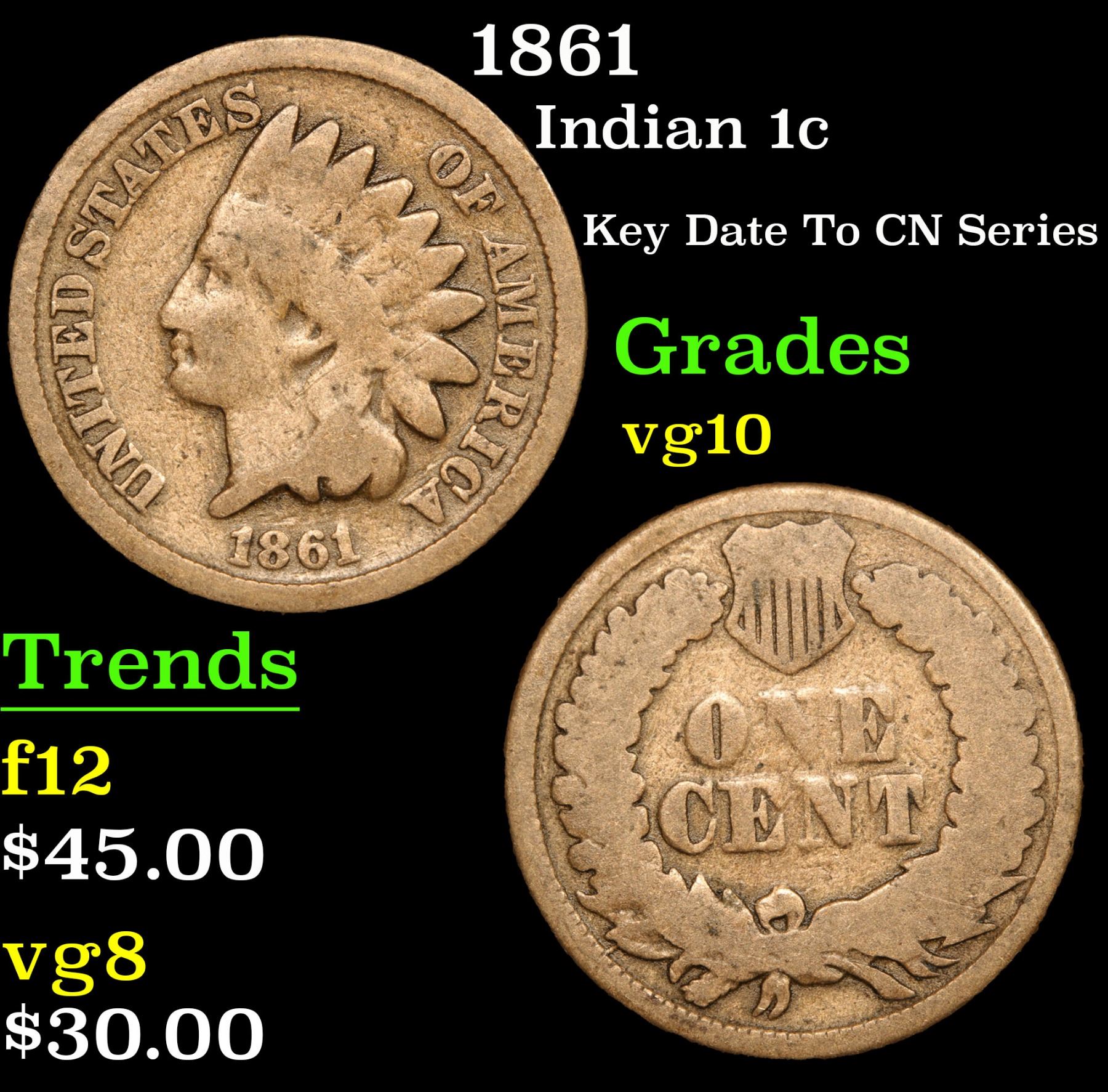 1861 Key Date To CN Series . Indian Cent 1c Grades vg+. Key Date. According to David Hall, The 1861 is the lowest mintage of the 1860-64 copper-nickel Indian cents. It is the rarest copper-nickel Indian cent in circulated grades."