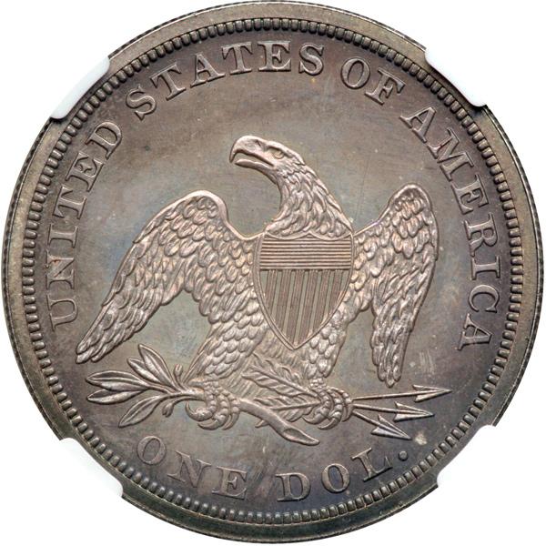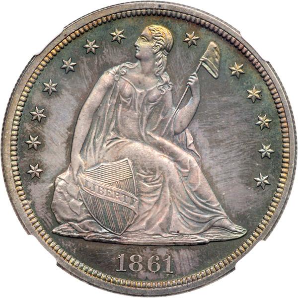 1861 Liberty Seated Dollar. NGC graded Proof 66. Lovely rainbow toning. Only 1,000 proofs struck. Originality is a hallmark of both sides, with rich antique-copper toning that yields to warmer golden-apricot undertones as the obverse dips into a light, turning to greenish gold at the obverse rim. Full mirror reflectivity is also evident when the coin is held at the correct angles. Needle-sharp in all areas, and uncommonly pristine-looking for a Proof Silver Dollar of the No Motto type, last produced in 1865.