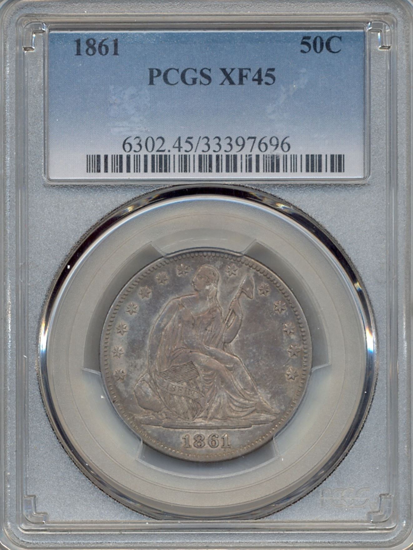 One 1861 Liberty Seated Half Dollar Coin PCGS XF45.
