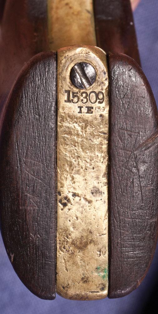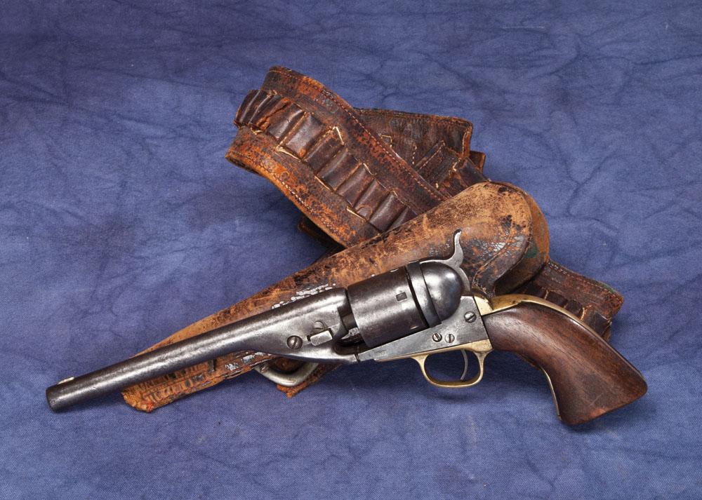The grips on this well worn gun have Lincoln County history. The early and worn belt and slim jim holster match up very well with the Navy. The bottom of the stocks are ranch carved with Lincoln NM. It is noticeable that the grips are replacement on the revolver but have been on this piece for quite a while.