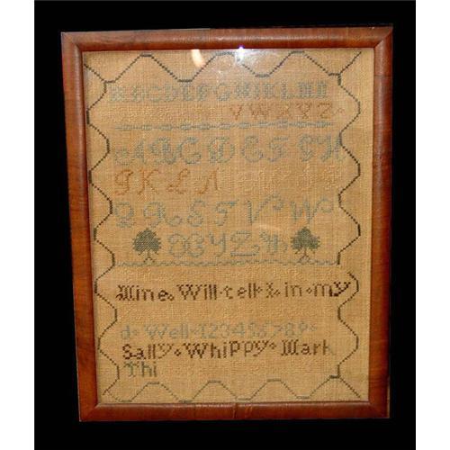 This work was started and not completed as you can see a faint cross stick outline of the intended needle point. Half the letters on the second line are not done, as are half on the 4th line (one can see a letter half way completed). The 7th and 9th lines are not done at all and the last line is also a partial. When one looks closely at the last 4 characters of the last line one can clearly make out 1861, which is consistent with the period frame and wear to the piece. This is the first sampler that we have come across to be not be completed. Despite these interesting facts someone back in the 29th century decided that this was an incredibly moving work of art enough to have it professionally framed an a nice period oggi wood frame with the original J. H. Miller Co. Inc Springfield Mass label. This piece would make and interesting conversation piece addition to any fine collection. ****NOTE: Email for larger images.