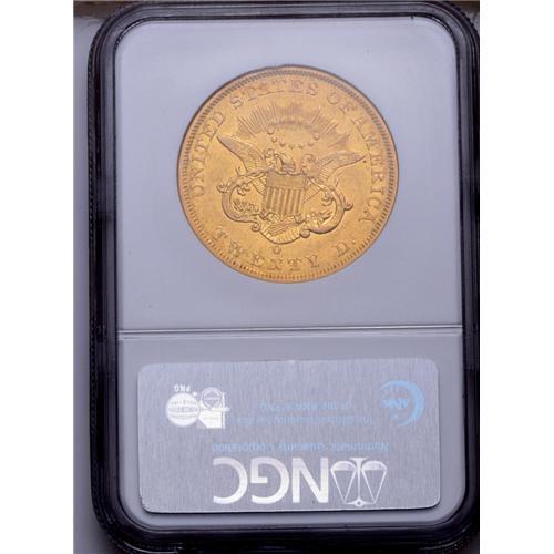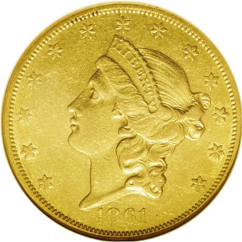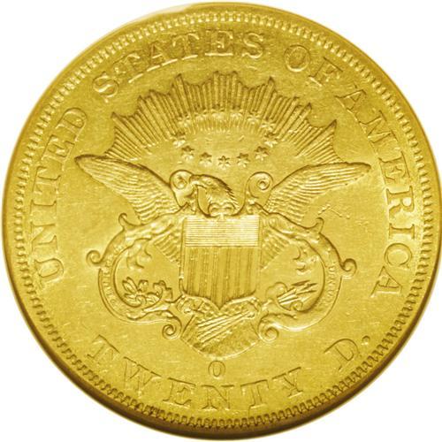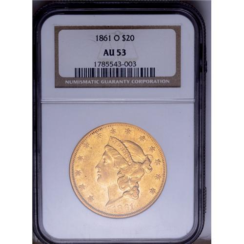 <B>1861-O<$20> AU53 NGC.</B></I> It is not known if this is a product of the United States, the State of Louisiana, or the Confederacy. Most numismatists agree that the first 5,000 coins, struck in January 1861, were issued under authority of the United States government prior to January 26, 1861. The next 9,750 pieces, coined from January 26 to May 31, 1861, were issued under authority of the State of Louisiana, and the remaining 2,991 pieces were struck under authority of the Confederate States government after June 1, 1861. It is not possible to determine which entity produced any given coin, but that didn't stop Walter Breen, who suggested that: "possibly the rebel strikings are those with greatest weakness at base of date."<BR> The total mintage was 17,741 coins, and nearly every example that survives today is well circulated, although PCGS and NGC have combined to certify seven Mint State coins. A single AU58 example was recovered in the <I>S.S. Republic</B></I> treasure. Winter and Crum were not willing to acknowledge the existence of any Mint State examples: "The 1861-O is a scarce and historically significant issue. It is most often seen in Very Fine and Extremely Fine grades. It is very scarce in lower About Uncirculated grades and it is rare in about Uncirculated-55. Properly graded About Uncirculated-58 examples are very rare and there are currently no pieces that grade Uncirculated. This issue is still quite undervalued considering its rarity and significance."<BR> The typical 1861-O double eagle is poorly struck with considerable weakness, especially at the lower part of the obverse, including the date and stars. Nearly all known examples have myriad abrasions and a number of deeper marks, including scratches and scrapes. The usual appearance is rich green-gold color and most examples have below average eye appeal. These are all reasons to described this example a