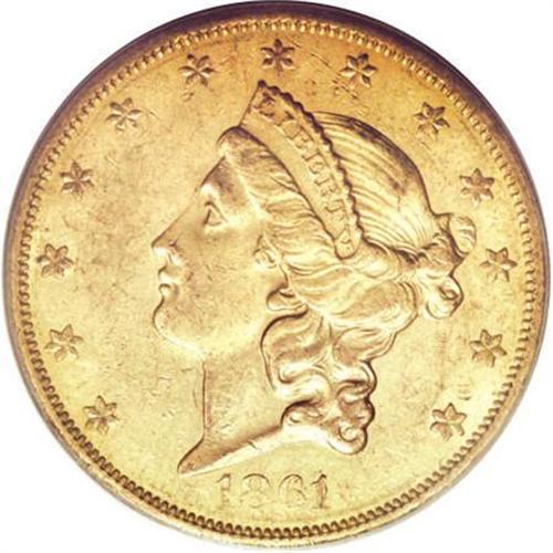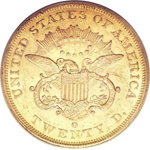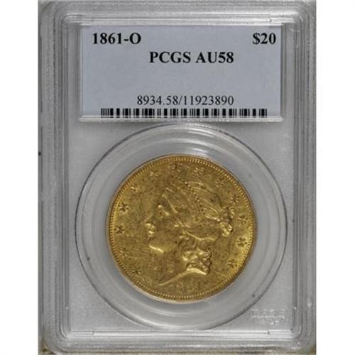 <B>1861-O $20 AU58 PCGS.</B></I> As a denomination, the double eagle has more than its fair share of lore, and the story of the 1861-O twenties is one of the most fascinating. Of the 17,741 pieces coined at the New Orleans Mint, only 5,000 of the coins were struck under the authority of the United States. After Louisiana's secession from the Union but before its inclusion as part of the Confederacy, the facility minted 9,750 double eagles for Louisiana as an independent state. The remaining 2,991 examples were coined under the auspices of the Confederate States of America before supplies gave out.<BR> Numismatists have long sought out a way of differentiating the Confederate strikings from the rest of the issue, though suggestions remain speculative. The most plausible hypothesis, as described by Q. David Bowers and Southern gold specialist Doug Winter, is that the coins bearing a bold, crudely re-engraved date were the last pieces struck, and therefore Confederate coins. By contrast, the present piece shows distinct weakness at the lower parts of the digits in the date, suggesting an earlier origin.<BR> Nonetheless, this coin is immensely desirable for its eye appeal and surprising condition. Rich yellow-orange surfaces retain ample detail, and while Liberty's hair detail is imperfect, the overall definition far exceeds the norm. The fields and devices show a number of fine abrasions and a touch of friction, but its overall appearance is excellent, and even the coin's most significant flaw, a mark to the right of the eagle on the reverse, is hardly distracting. An attractive and important representative of this era-ending issue, the last Type One double eagle struck at New Orleans. Population: 4 in 58, 2 finer (1/08).<BR><BR><B>Coin Engraver:</B> James B. Longacre<BR><BR><b>Shipping:</b> Coins & Currency (<a target="_blank" href="http://www.heritageauctions.com/common/shipping.php">view shipping information</a>)