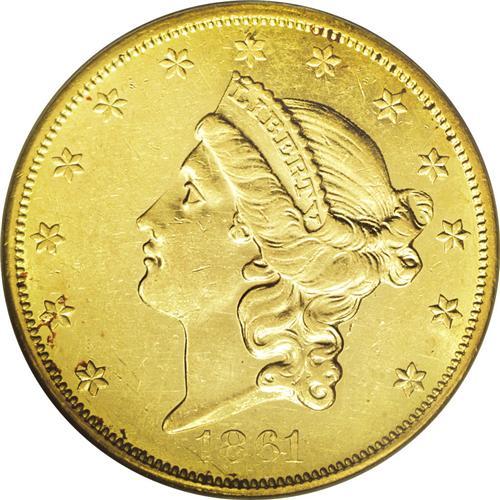 <B>1861-O<$20> XF45 PCGS.</B></I> The 1861-O is the final Type One double eagle from this Southern mint and it is a desirable, historic issue. A total of 17,741 pieces were struck. 5,000 pieces were produced by the Union and the rest were struck on order of the Confederacy. In the past, it has been stated that those with weakness on the date are the coins struck by the Confederacy but this cannot be proved with complete accuracy. As a date, the 1861-O is similar in rarity to the 1857-O and the 1858-O but it is considerably scarcer in high grades. In fact, in the upper ranges of AU, the 1861-O is fully comparable to the more-heralded 1859-O and 1860-O.<BR> This example has a lovely yellow-gold tint with light wear visible across the high points of the design, and has isolated areas of prooflike luster visible in protected areas. A few moderate abrasions are present, but none are individually distracting or unusual for the grade. An ideal specimen for a specialized double eagle collection.