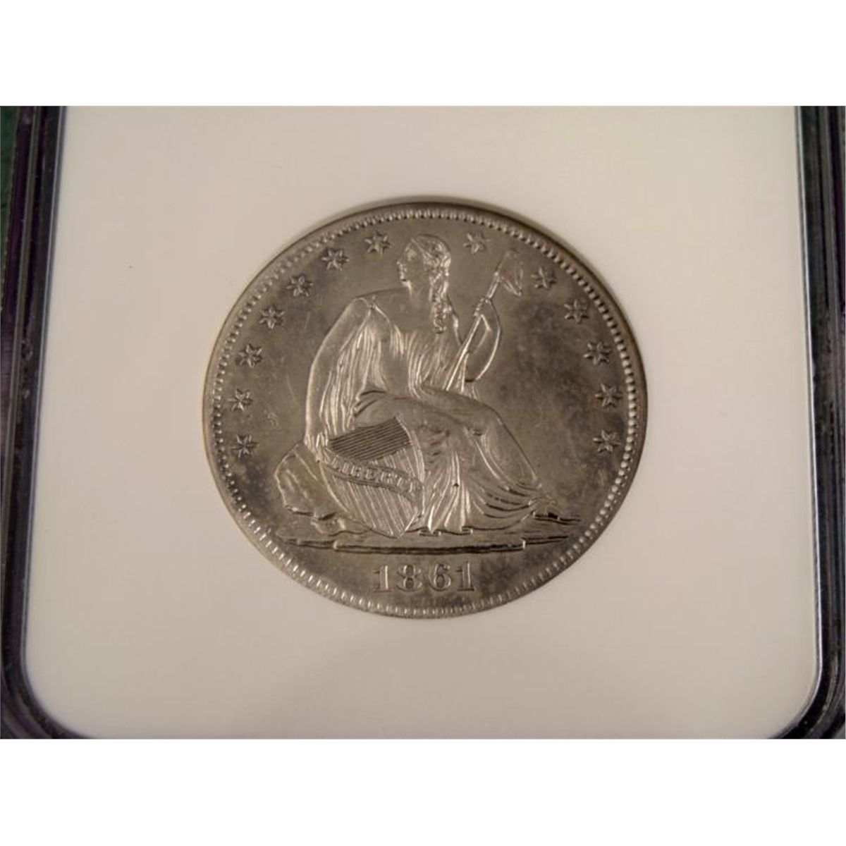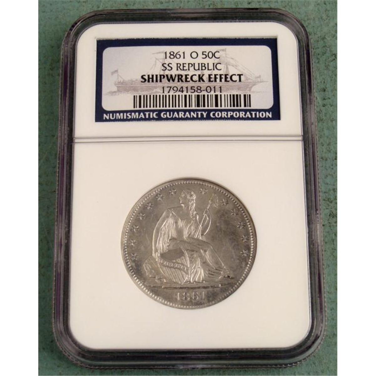 1861 Half Dollar * Mint mark: O (New Orleans)Graded by: Numismatic Guaranty Corporation * This date was actually struck by three different governments at the outset of the Civil War: The United States, the State of Louisiana, and the Confederate States of America. This coin has the added historical interest of being part of the recovered treasure from the SS Republic. The ship was lost in a hurricane and was discovered in 2005. It shows some "shipwreck effect."