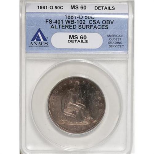 <B>1861-O 50C --Altered Surfaces--ANACS. MS60 Details.</B></I> FS-401. WB-102. The so-called "Confederate Obverse," which shows the telltale die crack running from the rim to Liberty's nose. Both sides of this lustrous piece show elements of gold, peach-rose, and plum, though the toning is shallow.<BR><BR><B>Coin Engraver:</B> Christian Gobrecht<BR><BR><b>Shipping:</b> Coins & Currency (<a target="_blank" href="http://www.heritageauctions.com/common/shipping.php">view shipping information</a>)