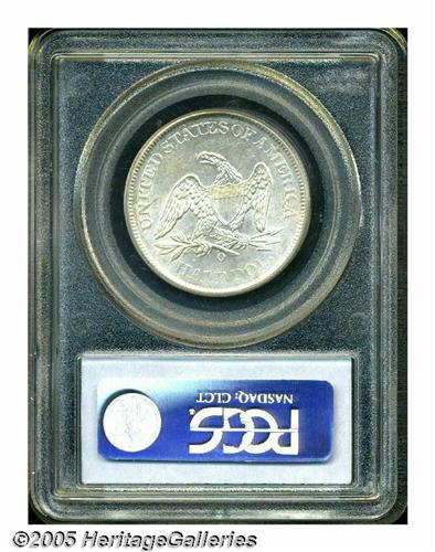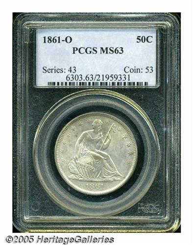 <B>1861-O<50C> MS63 PCGS.</B></I> Sharply struck with pale cream-gray color, shimmering luster, and a few wispy marks, mostly on the reverse, that prevent a higher grade. Popular as a Civil War issue from New Orleans. Population: 33 in 63, 32 finer (4/05).