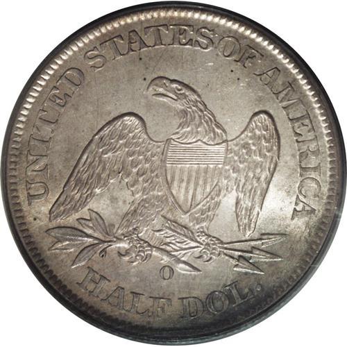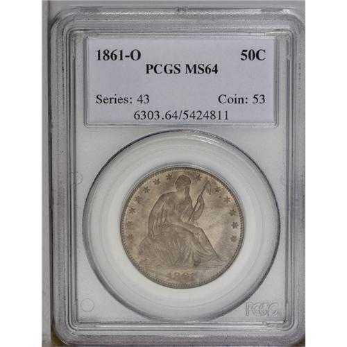 <B>1861-O<50C> MS64 PCGS.</B></I> The 1861-O half dollar is an issue steeped in history. Just prior to the rebel takeover of the New Orleans Mint, the coiner delivered 330,000 O-Mint half dollars for the Union. After Louisiana seceded from the Union, the state coined 1,240,000 1861-O half dollars for their own purposes, as well as a further 962,633 for the Confederate State of America. As this specimen presented here does not display either the obverse or reverse die cracks that Wiley and Bugert attribute to the "Confederate" strikings, this example probably comes from the earlier Union delivery. Lustrous surfaces display grayish-gold toning, joined on the reverse by a splash or two of sky-blue and lavender. The design elements are sharply impressed, and the surfaces are devoid of significant contact marks. Population: 20 in 64, 11 finer (3/06). <BR><BR><B>Important notice:</B> Heritage usually auctions material at the rate of 200-250 lots per hour. On some occasions eBay Live bid software or the Internet may not be able to keep up with the pace of the auction. We recommend placing a realistic absentee bid now as insurance to avoid disappointment. Occasionally the auctioneer may eliminate or reject an eBay Live bid, and the auctioneer may also reopen a lot after the close of the eBay live bidding (usually because we missed an audience bid), and may reject your bid even if it shows you as the winning bidder. By bidding via eBay Live, you agree that Heritage may award the lot to another bidder at its sole discretion under the circumstances described above or any other reasonable circumstances. Since eBay bids are not shown to us until we open the lot on the floor, we treat those bids just like floor bids. In most cases the floor responds before the eBay bid is presented to us, due to Internet lag time, so for consistency we have made it a policy that floor bids are always considered first over tie eBay live bids. Also please note that all Heritage lots purchased through eBay Live carry a 20% Buyer's Premium. Please make sure you read the Terms and Conditions before you bid. This lot is being auctioned in conjunction with a live floor auction by Heritage Galleries & Auctioneers. All final auction and invoice information will be supplied by Heritage Galleries & Auctioneers, and all other information should be considered preliminary. Lot:2010 <BR><BR><B>Winning Notification and Billing:</B> After the FINAL session in this auction is complete, Heritage will send e-mail and snail mail invoices. This process normally takes several days. All final auction and invoice information will be supplied by Heritage Galleries & Auctioneers, and all other information should be considered preliminary. <BR><BR>This auction will be conducted on a live auction floor and over the Internet through eBay Live. If you choose to place an absentee bid, please take a moment to <font color='#0000ff'><u><a href='http://pages.ebay.com/liveauctions/help/before/laabsentee.html'>learn how eBay Live absentee bidding works</a></u></font><font color='#000000'>