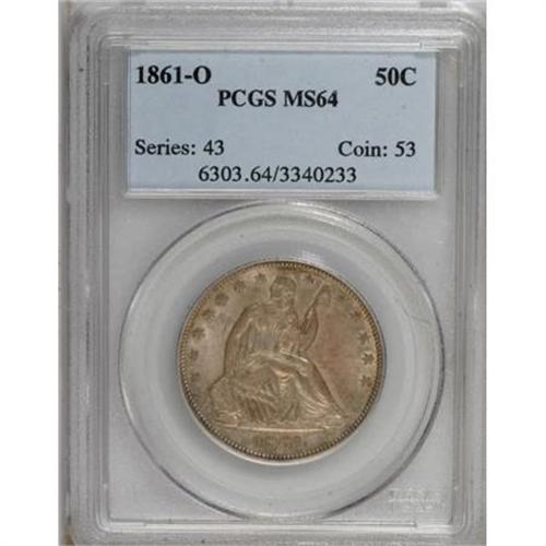 <B>1861-O 50C MS64 PCGS.</B></I> Delicate rose and blue tints with a touch of gold grace the luminous surfaces of this near-Gem. Well-defined in the centers, though the peripheral elements show some softness. An attractive example from one of the most dramatic years for the New Orleans Mint. Population: 20 in 64, 12 finer (8/07).<BR><BR><B>Coin Engraver:</B> Christian Gobrecht<BR><BR><b>Shipping:</b> Coins & Currency (<a target="_blank" href="http://www.heritageauctions.com/common/shipping.php">view shipping information</a>)