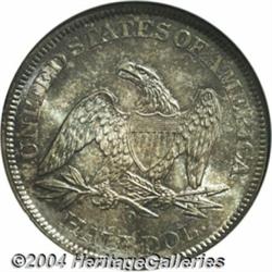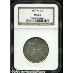 <B>1861-O<50C> MS66 NGC.</B></I> Rich sea-green and golden-brown patina bathes this lustrous and boldly struck premium Gem. The reverse is gorgeously undisturbed, while the obverse has only moderately marked. The final New Orleans Seated Half, since production of the denomination at the southern mint did not resume until the Barber design was introduced in 1892. The 1861-O was struck under the authority of three different governments, the United States of America, the state of Louisiana, and the Confederate States of America. The obverse of this piece features a mint-made die crack from the first star along the base of the rock to the final star. Population: 3 in 66, none finer (6/04). <BR><BR><B>Important notice:</B> Heritage usually auctions material at the rate of 200-250 lots per hour. On some occasions eBay Live bid software or the Internet may not be able to keep up with the pace of the auction. We recommend placing a realistic absentee bid now as insurance to avoid disappointment. Occasionally the auctioneer may eliminate or reject an eBay Live bid, and the auctioneer may also reopen a lot after the close of the eBay live bidding (usually because we missed an audience bid), and may reject your bid even if it shows you as the winning bidder. By bidding via eBay Live, you agree that Heritage may award the lot to another bidder at its sole discretion under the circumstances described above or any other reasonable circumstances. Since eBay bids are not shown to us until we open the lot on the floor, we treat those bids just like floor bids. In most cases the floor responds before the eBay bid is presented to us, due to Internet lag time, so for consistency we have made it a policy that floor bids are always considered first over tie eBay live bids. Also please note that all Heritage lots purchased through eBay Live carry a 20% Buyer's Premium. Please make sure you read the Terms and Conditions before you bid. </span></font></tr></table></td></tr></table>