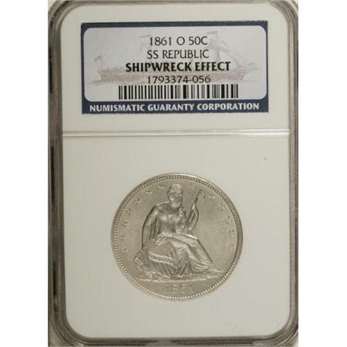 <B>1861-O 50C Shipwreck Effect NGC.</B></I> Variety W-09. No details grade is designated by NGC, but we believe the coin has Mint State sharpness. The luster is diminished, and the white surfaces are slightly granular, particularly above UNITED STATES. This lot is accompanied by a presentation box, booklet, DVD, and certificate of authenticity from Odyssey Marine Exploration, Inc.<BR><I>From The Vanek Collection.</B></I><BR><BR><b>Shipping:</b> Coins & Currency (<a target="_blank" href="http://www.heritageauctions.com/common/shipping.php">view shipping information</a>)