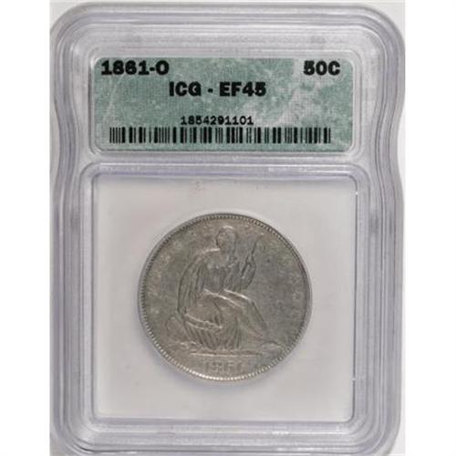 <B>1861-O 50C XF45 ICG.</B></I> NGC Census: (10/178). PCGS Population (13/171). Mintage: 2,532,633. Numismedia Wsl. Price for NGC/PCGS coin in XF45: $151. (#6303)<BR><BR><B>Coin Engraver:</B> Christian Gobrecht<BR><BR><b>Shipping:</b> Coins & Currency (<a target="_blank" href="http://www.heritageauctions.com/common/shipping.php">view shipping information</a>)