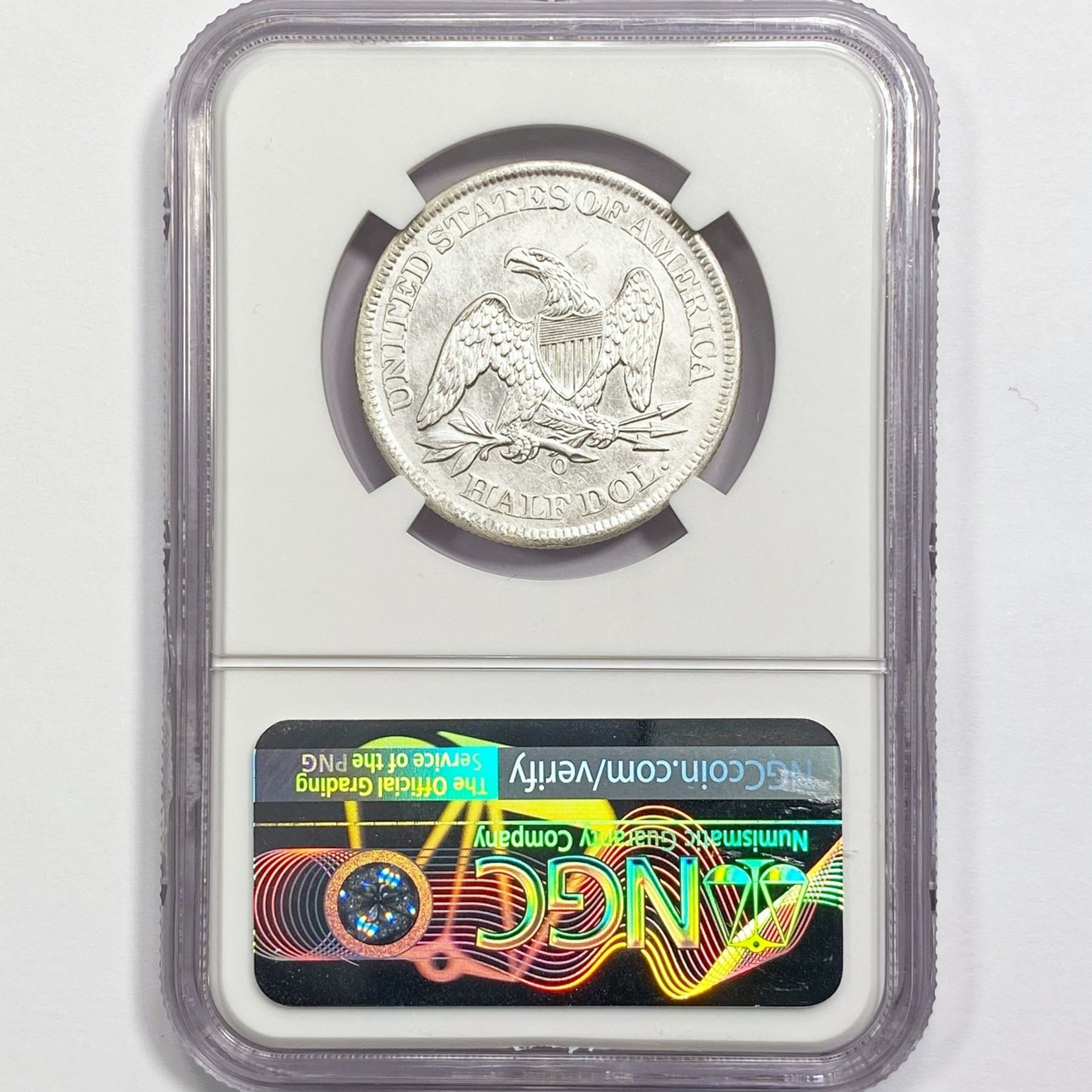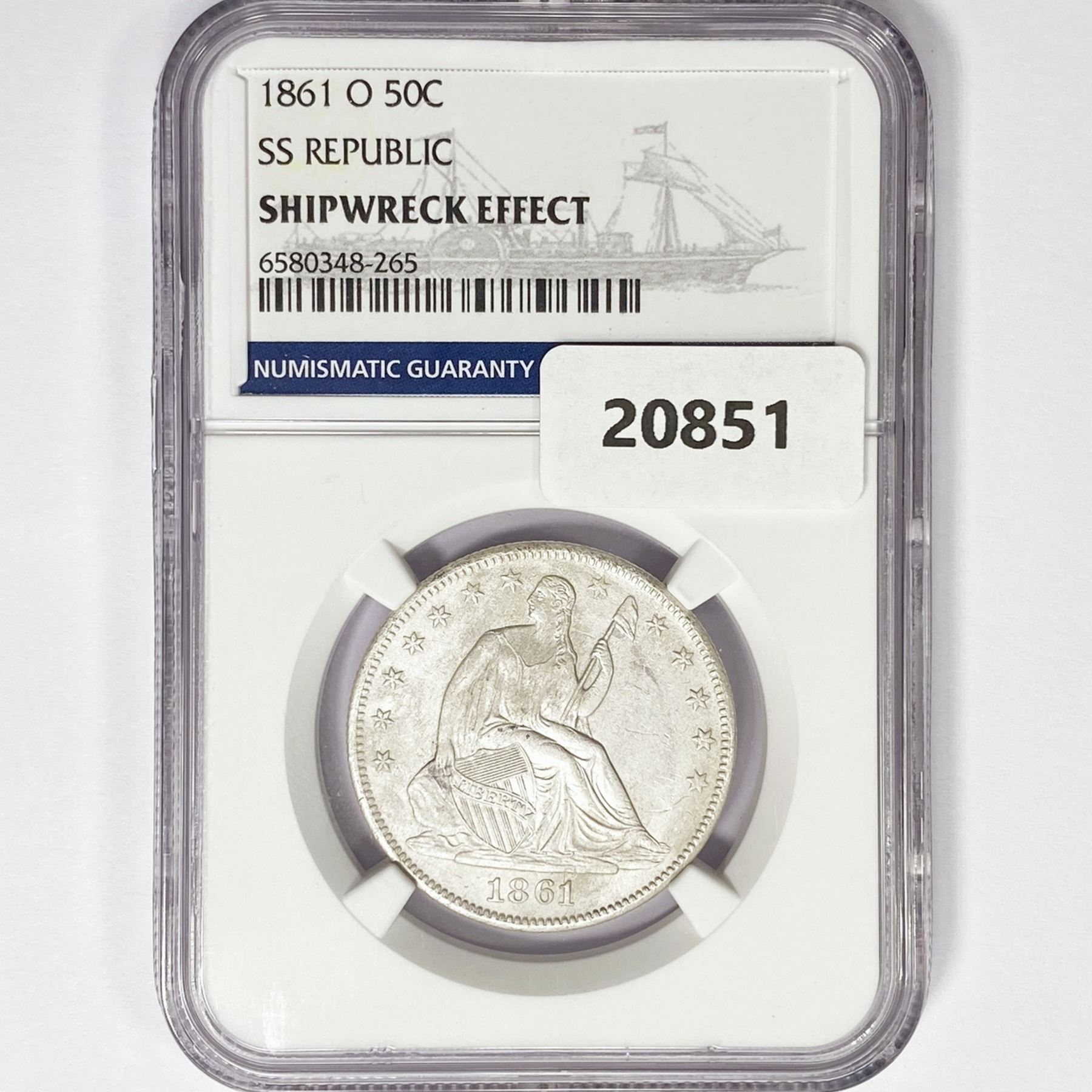 1861-O Seated Lib. 50C NGC Shipwreck SS Rep Bx