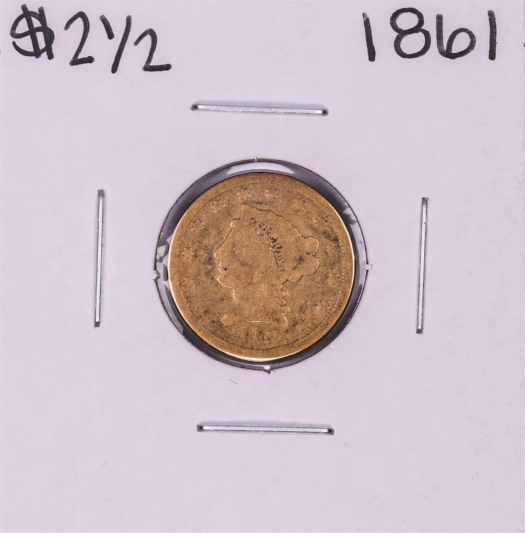 One 1861 Old Reverse $2 1/2 Liberty Head Quarter Eagle Gold Coin.