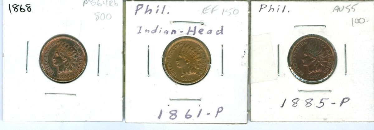 1861-P, 1868 & 1885-P 1¢. Lot of 3 coins all technically AU or better but lightly cleaned.
