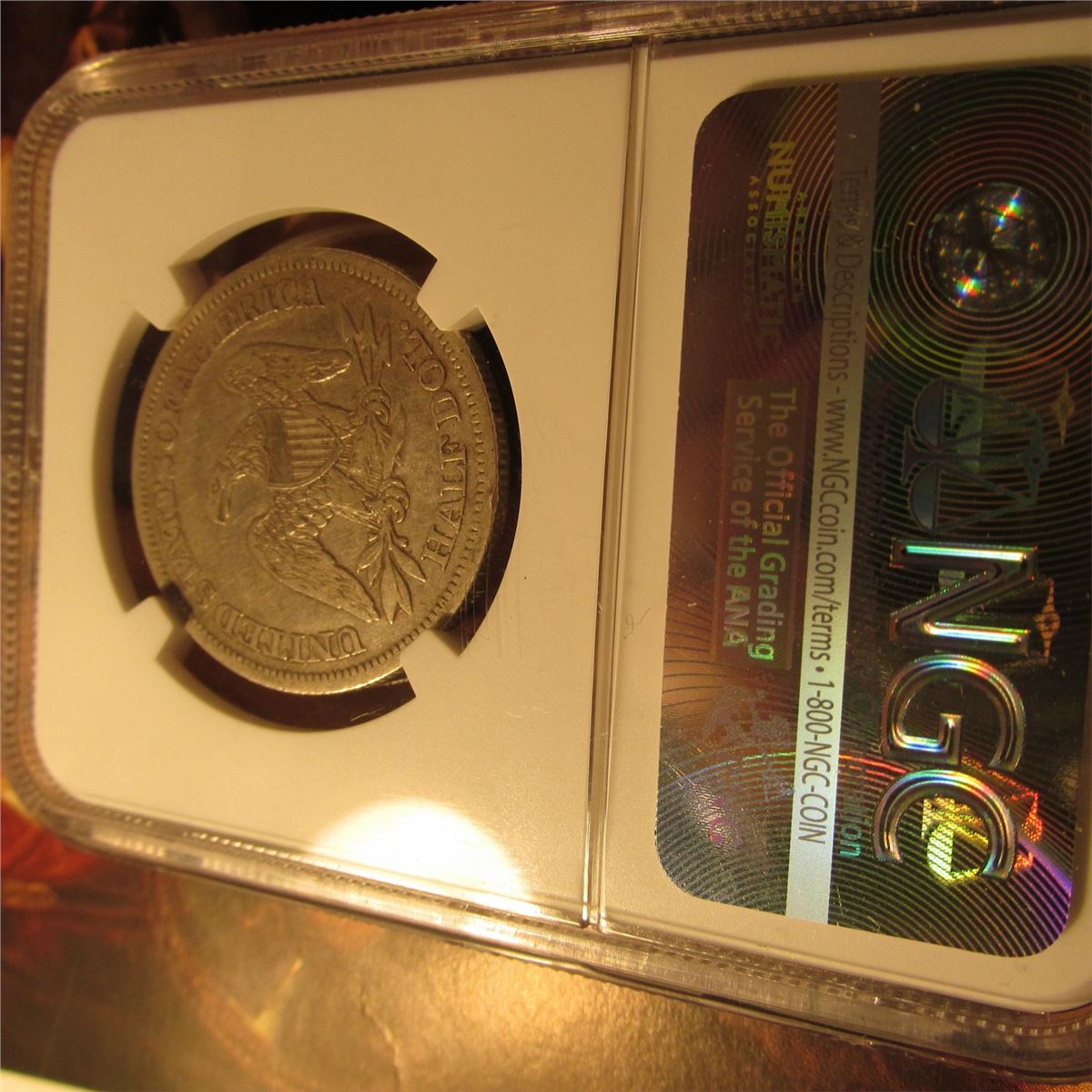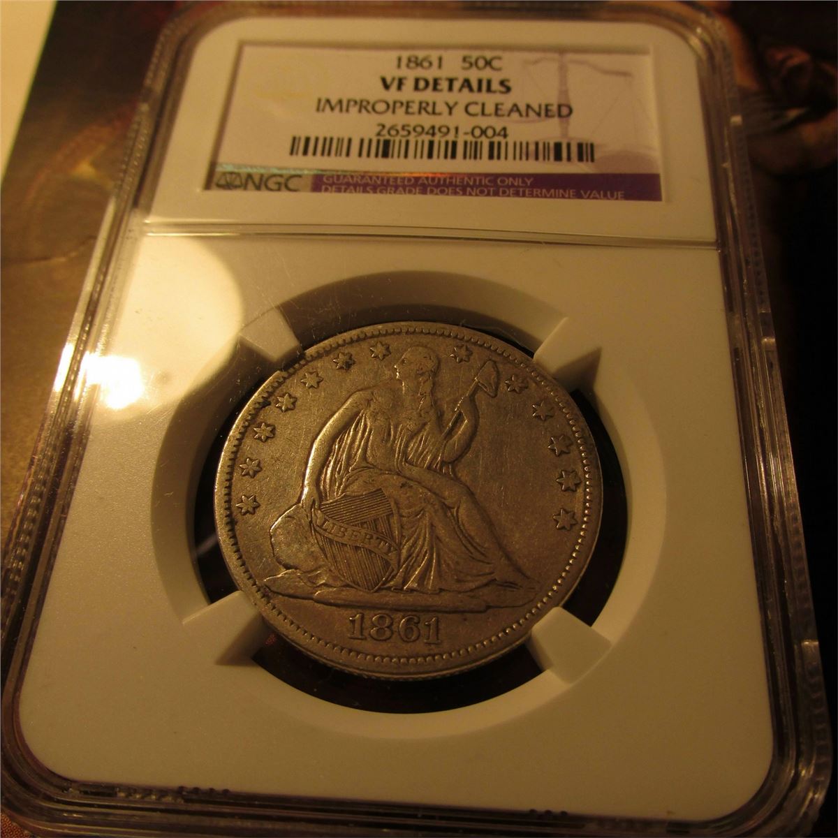 1861 P U.S. Seated Liberty Half-Dollar. NGC slabbed "VF DETAILS IMPROPERLY CLEANED".