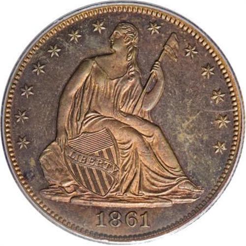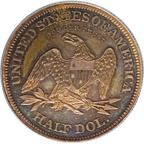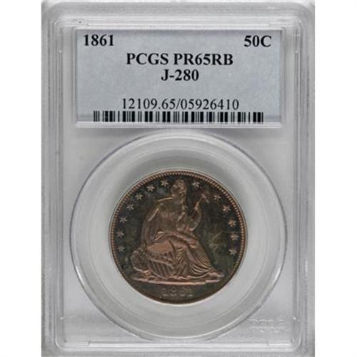 <B>1861 P50C Seated Half, Judd-280, Pollock-331, Low R.7, PR65 Red and Brown PCGS.</B></I> A With Motto half dollar that is similar to the as-struck Seated half, except the motto GOD OUR TRUST is set directly into the upper reverse field. Struck in copper with a reeded edge. Obviously struck at some time later than 1861 as the suggestion for a motto on coinage was not made until 1863. Significant portions of original mint red survives, especially around the devices. A well-balanced Gem with nicely reflective fields.<BR><BR><b>Shipping:</b> Coins & Currency (<a target="_blank" href="http://www.heritageauctions.com/common/shipping.php">view shipping information</a>)