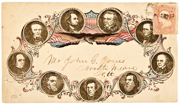 This colorful Patriotic Postal Cover measures 6” x 3.5” and is complete with its full flap. There are nine separate engravings illustrating Abraham Lincoln’s Presidential Cabinet including: Abe Lincoln, Scott, Cameron, Chase, Wells, Seward, Bates, Smith and Blair. Around each portrait is red, white and blue accents with Abe Lincoln and Scott at the top, surrounded by American Flags with a Heraldic Shield between them. Around each man’s head is a border with his name for easy identification. A fine 2” long repaired tear at left, soiled from actual use having period notations written upon its reverse. A very nice, unusual Civil War Patriotic cover showing Lincoln and His Cabinet with a partial “WASHINGTON” CDS. This design is Walcott 210 and Bischel 376 marked “Extremely Rare” and priced at $2,500 in that major reference some 12 years ago.
