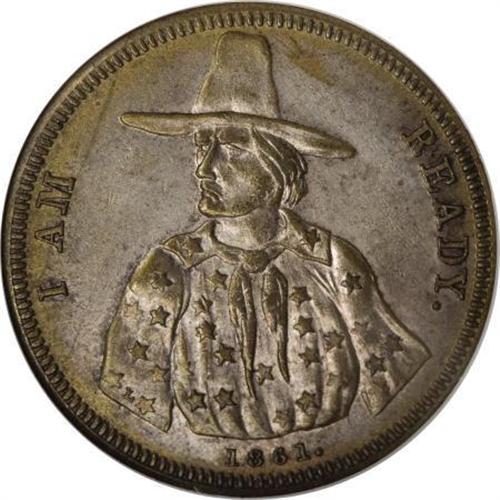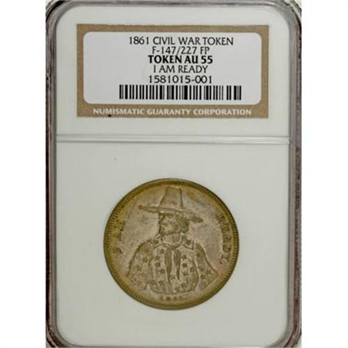 <B>1861 I Am Ready Patriotic Token AU55 NGC.</B></I> Fuld-147/227fp, R.6. This half dollar-sized patriotic token still shows some of the green-gold gilt in protected areas. Luster outlines the legends and devices of this primarily silver-gray example. Careful rotation locates patches of hairlines.<BR><BR><b>Shipping:</b> Coins & Currency (<a target="_blank" href="http://www.heritageauctions.com/common/shipping.php">view shipping information</a>)