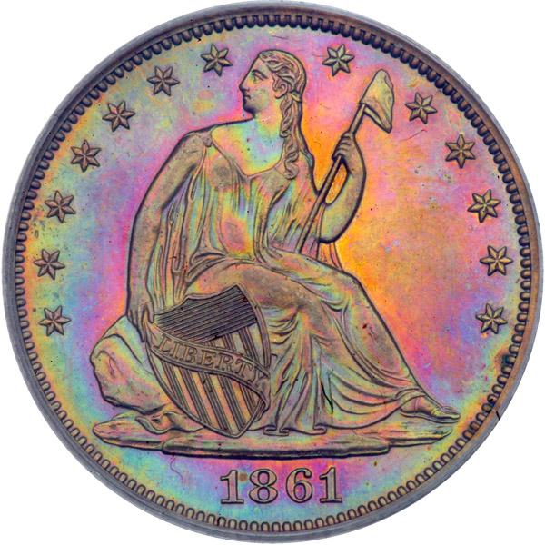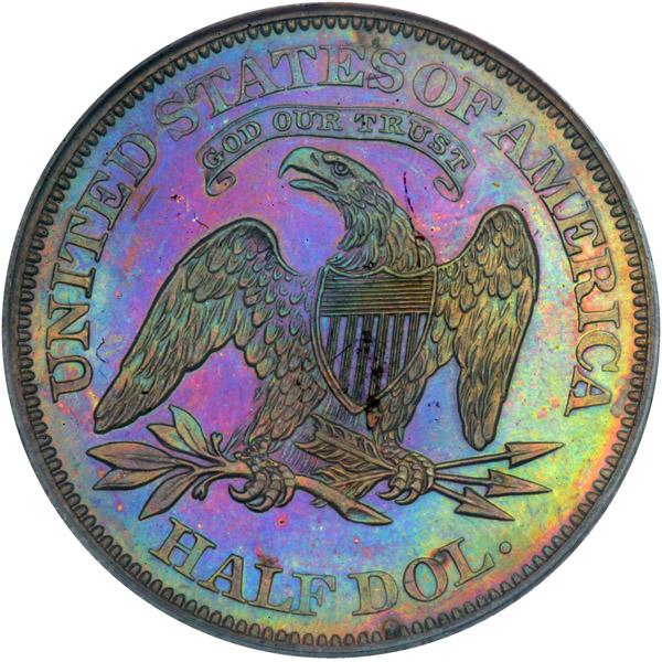 1861 Pattern Half Dollar. Copper Reeded Edge. Judd-278. Pollock-327 Low Rarity 7. PCGS graded Proof 62 Brown PQ. CAC Approved. Lovely red and green toning with some iridescent magenta and blue to further excite the color sensors in your eyes. During 1861 several Patterns were introduced including the set of quarter dollar and half dollar, with the motto GOD OUT TRUST on the reverse, of which this is a splendid example in copper. Pop 1; 7 finer, 3 in 63, 1 in 64, 3 in 65 (PCGS # 12102) .