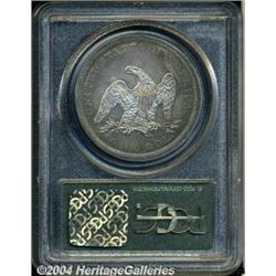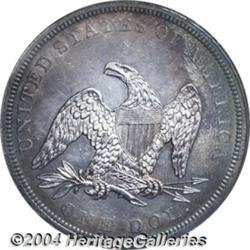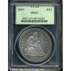 <B>1861<S$1> MS61 PCGS.</B></I> Although the Mint Act of February 21, 1853 reduced the weight of the Half Dime, Dime, Quarter, and Half Dollar, the Silver Dollar remained unchanged as the unit of our coinage system. This curious omission resulted in the Seated dollar's disappearance from everyday circulation and its development into a "Trade" dollar. By 1861, the precedent of exportation and melting was firmly entrenched and most of the 77,500 business strikes produced by the Philadelphia Mint this year suffered the same fate.<BR> An attractive coin for the toning enthusiast, both sides are awash in lavender-gray patina with blushes of sea-green and russet shades about the peripheries. The strike is razor sharp throughout and the surfaces are devoid of all but the most trivial, well concealed abrasions. This conservatively graded lot represents a definite find for the dedicated Seated Dollar collector. <BR><BR><B>Important notice:</B> Heritage usually auctions material at the rate of 200-250 lots per hour. On some occasions eBay Live bid software or the Internet may not be able to keep up with the pace of the auction. We recommend placing a realistic absentee bid now as insurance to avoid disappointment. Occasionally the auctioneer may eliminate or reject an eBay Live bid, and the auctioneer may also reopen a lot after the close of the eBay live bidding (usually because we missed an audience bid), and may reject your bid even if it shows you as the winning bidder. By bidding via eBay Live, you agree that Heritage may award the lot to another bidder at its sole discretion under the circumstances described above or any other reasonable circumstances. Since eBay bids are not shown to us until we open the lot on the floor, we treat those bids just like floor bids. In most cases the floor responds before the eBay bid is presented to us, due to Internet lag time, so for consistency we have made it a policy that floor bids are always considered first over tie eBay live bids. Also please note that all Heritage lots purchased through eBay Live carry a 20% Buyer's Premium. Please make sure you read the Terms and Conditions before you bid. </span></font></tr></table></td></tr></table>