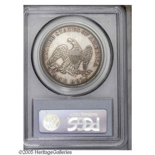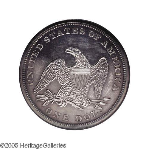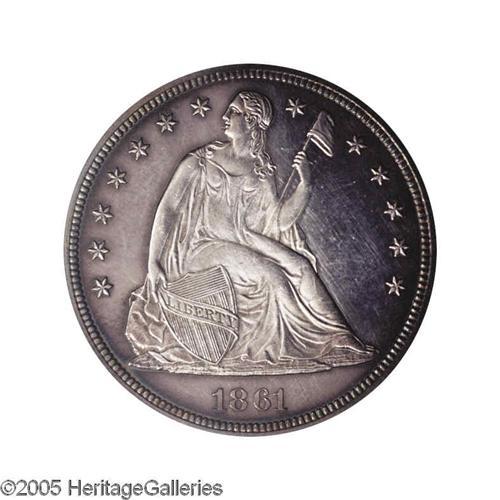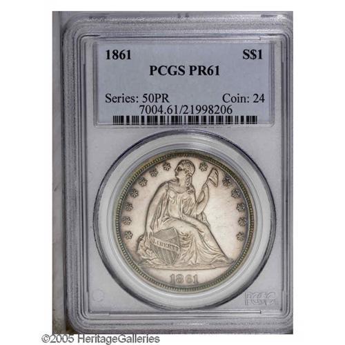 <B>1861<S$1> PR61 PCGS.</B></I> Despite numerous grade-defining hairlines, this snappy proof Dollar exhibits deeply mirrored fields and modestly frosted devices that impart a pleasing overall appearance. Moderately toned, this example reveals blue-gray patina that deepens toward the outermost protected areas. The elusiveness of the business strike 1861 Seated Dollar has placed considerable date collector pressure upon the extant proof specimens.