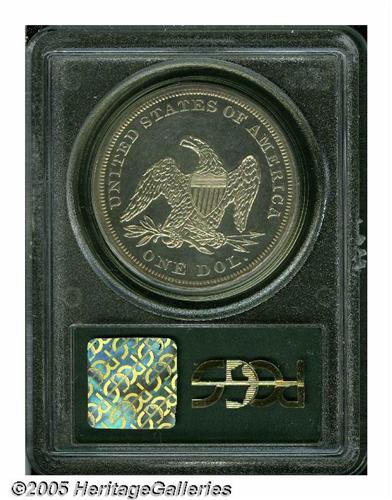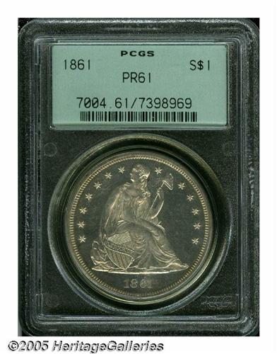 <B>1861<S$1> PR61 PCGS.</B></I> The listed proof mintage of this Civil War era date is 1,000 pieces, but at least 600 of those went unsold and were later melted. Fully struck with deeply mirrored sea-green fields and alabaster-gold devices. There is a small, circular lint mark (as struck) near the center of the right obverse field, as numerous wispy hairlines, evident on both obverse and reverse, limit the assigned grade of this specimen. Population: 18 in 61, 85 finer (6/05).<BR><I>From The Dr. John L. Pellegrini Collection of Liberty Seated Dollars.</B></I>