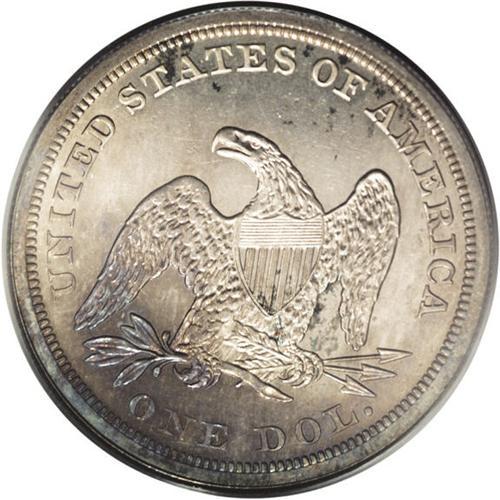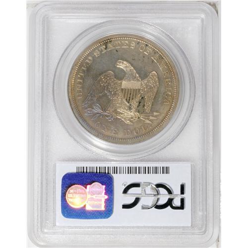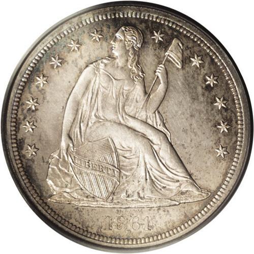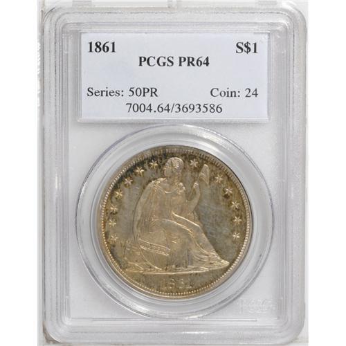 <B>1861<img border='0' src='http://www.heritagecoins.com/images/star.gif' width=10 height=10>$1> PR64 PCGS.</B></I> Fully struck with deeply watery fields and golden toning on the devices. Mottled cobalt-blue, purple, and lilac iridescence occurs near the periphery. A few faint hairlines seemingly prevent the Gem grade assessment. Population: 22 in 64, 7 finer (9/06).