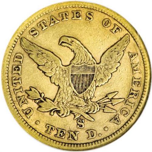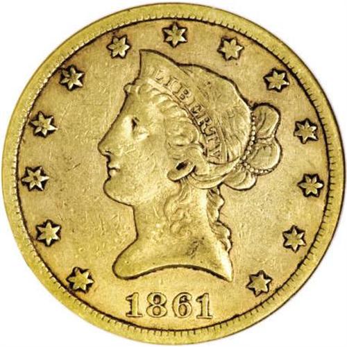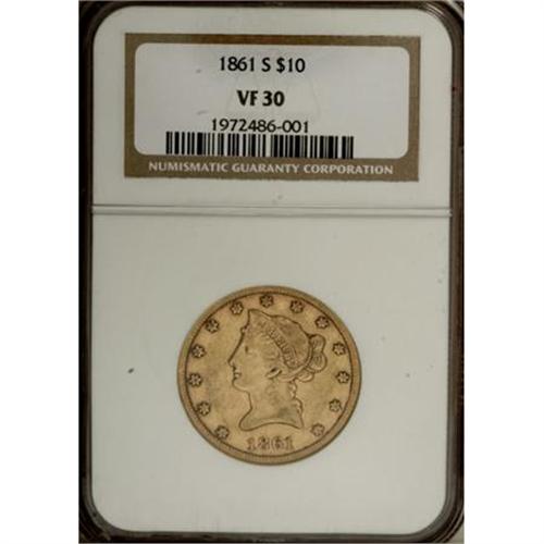 <B>1861-S $10 VF30 NGC.</B></I> Traces of luster cling to this chestnut-brown Civil War eagle. Obverse marks are unimportant for the grade, and traces of dirt in protected areas lend originality. The 1861-S is rare in all grades, not surprising given its low mintage of 15,500 pieces. Census: 1 in 30, 76 finer (12/07).<BR><BR><B>Coin Engraver:</B> Christian Gobrecht<BR><BR><b>Shipping:</b> Coins & Currency (<a target="_blank" href="http://www.heritageauctions.com/common/shipping.php">view shipping information</a>)