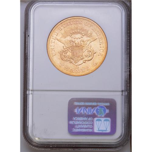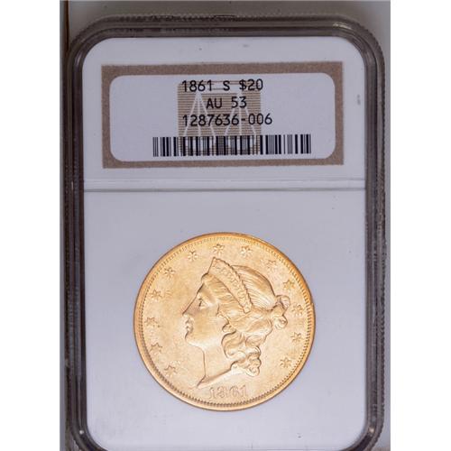<B>1861-S<$20> AU53 NGC.</B></I> A still-lustrous example of this Civil War-era issue. Well struck, though lightly worn with myriad abrasions on both wheat-amber sides.