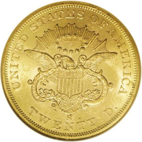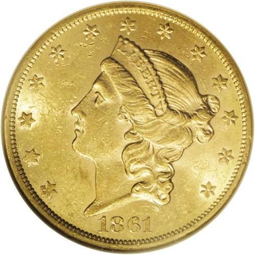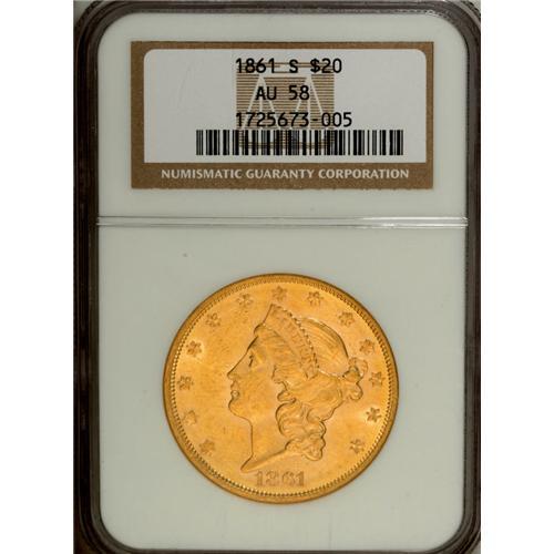 <B>1861-S $20 AU58 NGC.</B></I> After production of the Paquet reverse coins concluded, the San Francisco Mint turned its attention to the coinage of nearly 768,000 double eagles from the Longacre Type One design. This date was once considered scarce, but examples have been recovered from the <I>S.S. Brother Jonathan</B></I> and <I>S.S. Republic</B></I> treasures, considerably swelling the population. David Akers, writing in 1982, commented: "The majority of known specimens are well worn with F to EF being the typically available grades. In AU, the 1861-S is very scarce and in full Mint State it is rare." The <I>S.S. Brother Jonathan</B></I> treasure yielded over 40 examples, but mostly in worn condition with only one Mint State coin. The <I>S.S. Republic</B></I> was the source for nearly 100 additional coins, including 14 Mint State pieces. Even with these additional coins, the total Mint State population is still not more than 30 to 40 coins. At the next lower grade level, this AU58 example remains a desirable coin.<BR> Both sides are sharply detailed with crisp central motifs. The surfaces have frosty yellow-gold luster with full mint brilliance. Only a trace of wear can be seen with close inspection. The surfaces are lightly abraded with a few more moderate marks on the obverse.<BR><BR><b>Shipping:</b> Coin/Currency (<a target="_blank" href="http://www.heritageauctions.com/common/shipping.php">view shipping information</a>)