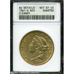<B>1861-S $20 --Cleaned--ANACS. AU Details, Net XF45.</B></I> Both sides are hairlined, however, considerable luster glows from recessed areas. The Paquet reverse was briefly struck in 1861, however, the present piece is instead from normal dies. Lot:9002