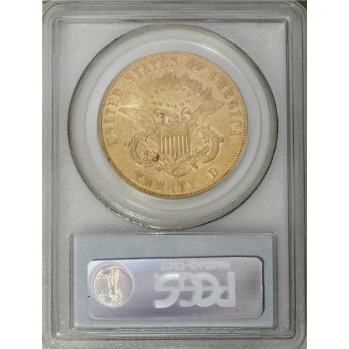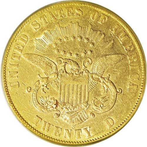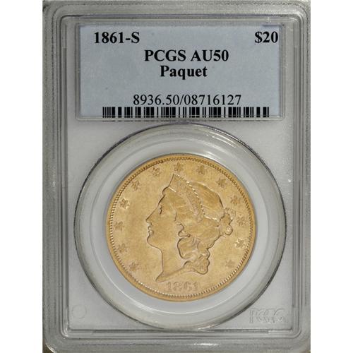 <B>1861-S $20 Paquet AU50 PCGS.</B></I> At a casual glance, few observers would notice any difference between the Paquet and the normal reverse of an 1861-S double eagle. A side-by-side comparison reveals subtle differences, however, most notably in the taller, thinner lettering. The width of the eagle is also greater, and the reverse stars are placed lower within the rays.<BR> The 1861-S Paquet reverse double eagle was not discovered until 1937. Walter Breen notes that: "Paul Wittlin turned up 25-30 in French and Swiss banks in the mid-1950s, mostly VF to EF with plenty of bagmarks." Apparently, these coins account for most of the known examples. The four pairs of dies that the Philadelphia Mint shipped to California, in November 1860, each contained an experimental tall letter reverse. Attributed to Assistant Engraver Anthony C. Paquet, these dies produced 19,250 1861-S double eagles that were destined to become the rarest issue of their denomination from the San Francisco Mint. Unknown in Mint State, AU examples are highly desirable. An undeniably attractive specimen, this coin displays reddish-golden surfaces, with a single red alloy spot noted near the eagle's left (facing) talon. A few trivial circulation marks are seen on each side, but these are minimal in terms of the coin's overall eye appeal. With ample remaining definition, this is a problem-free and immensely desirable representative of this prized rarity.<BR><I>From The Oak Island Collection.</B></I><BR><BR><b>Shipping:</b> Coin/Currency (<a target="_blank" href="http://www.heritageauctions.com/common/shipping.php">view shipping information</a>)