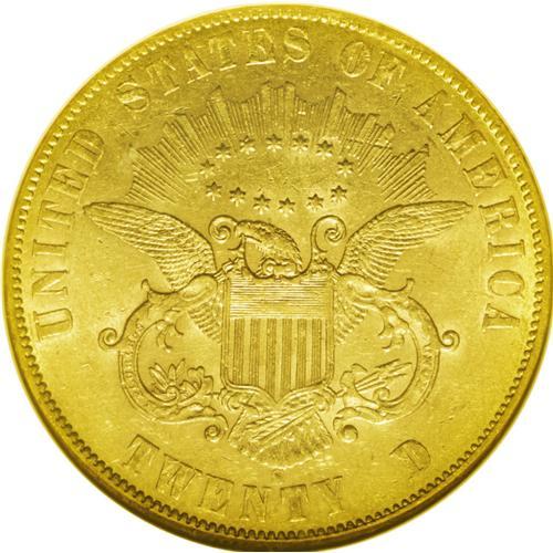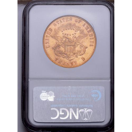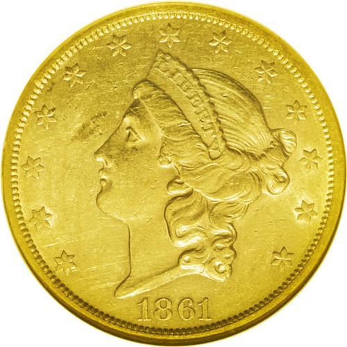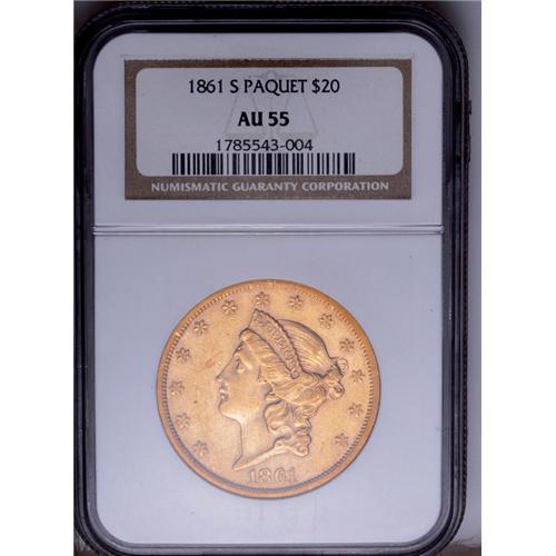 <B>1861-S<$20> Paquet AU55 NGC.</B></I> Reverse dies featuring the Anthony C. Paquet design were sent to San Francisco in November 1860, and production began shortly after the first of the year. Meanwhile, in Philadelphia, it was determined that the Paquet design was faulty, and that the coins would not strike up properly. The problem with the design was that the rim was too narrow, and would not properly balance the rim on the obverse die. Instructions to discontinue use of the Paquet dies were immediately sent to the San Francisco Mint on January 5, 1861, but that Mint did not receive word until February 2, after some 19,250 coins were produced. There was certainly no email in 1861, not even a completed telegraph line. San Francisco Mint Superintendent Charles Hempstead replied to the communication on February 9, noting that he had received the instructions and that the Paquet reverse dies had been removed from service, although he also noted in his reply that $385,000 had already been produced with these coinage dies, thus the source for the mintage figure. Today, it is estimated that about 1% of the original mintage still survives, or about 200 coins.<BR> Although Walter Breen credited the discovery of this variety to Arthur J. Fecht, who found an example in Hull, Texas and reported the discovery to <I>The Numismatist</B></I> in 1937, it was mentioned in the <I>American Journal of Numismatics</B></I> as early as 1895, and was apparently known before that time. Hull, Texas is located just a few miles northeast of Houston. Most examples that are known today have surfaced in the last 50 years, with many found in European gold holdings. At least one example, apparently a near-Mint grade coin, was recovered in the treasure of the <I>S.S. Republic.</B></I><BR> This is a pleasing light yellow-gold example with wispy rose color on each side, especially on the rims. The surfaces are exceptionally