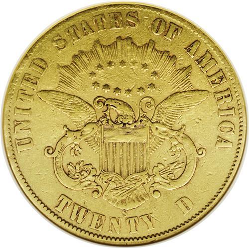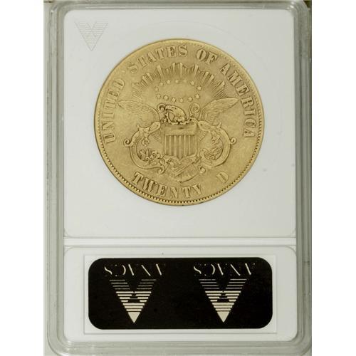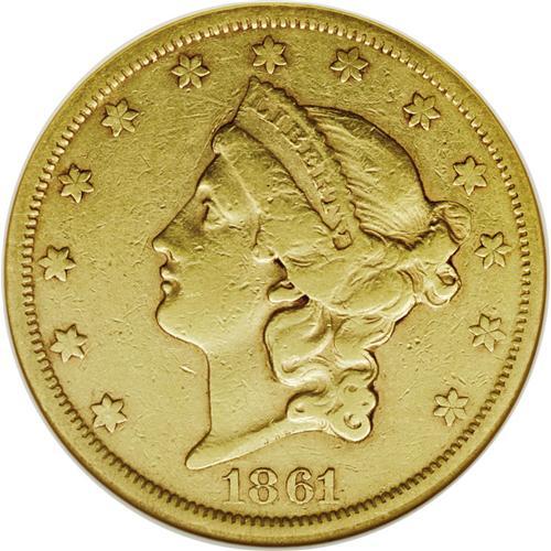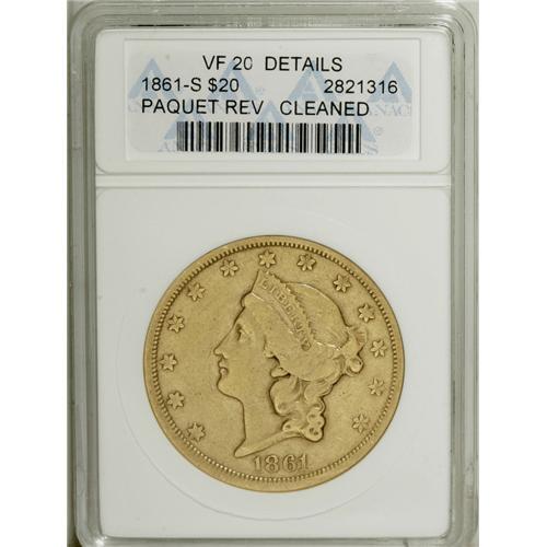 <B>1861-S $20 Paquet--Cleaned--ANACS. VF20 Details.</B></I> Sharper than implied by the VF20 Details designation, but the olive-yellow surfaces are subdued and slightly granular from a cleaning. The Paquet Reverse is one of the two key dates to the San Francisco Liberty double eagle series, along with the 1866-S No Motto. The Paquet Reverse is usually found in XF-AU grades, and such pieces routinely trade for tens of thousands of dollars. The present lot provides a much more affordable substitute.<BR><BR><b>Shipping:</b> Coin/Currency (<a target="_blank" href="http://www.heritageauctions.com/common/shipping.php">view shipping information</a>)