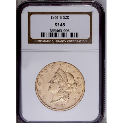 "1861-S $20 XF45 NGC. Bright, brassy-gol"