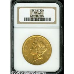 <B>1861-S $20 XF45 NGC.</B></I> The well detailed surfaces of this S-mint double eagle present a pleasing red-orange appearance. Numerous small abrasions are present, including one large bagmark on Liberty's cheek, and flakes of a brighter vermeil shade. Still, this piece is not unappealing, and should please a collector looking for an affordable representative of a Type One twenty.