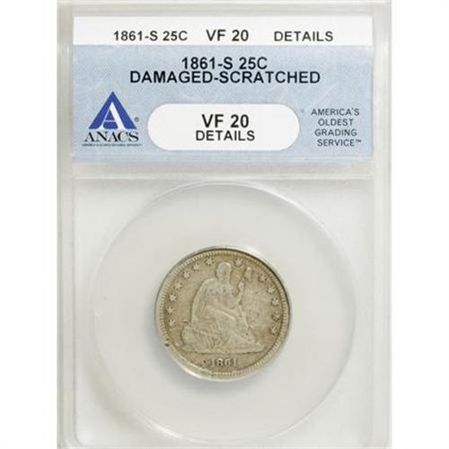 <B>1861-S 25C --Damaged, Scratched--ANACS. VF20 Details.</B></I> NGC Census: (0/12). PCGS Population (3/17). Mintage: 96,000. Numismedia Wsl. Price for NGC/PCGS coin in VF20: $275. (#5455)<BR><BR><B>Coin Engraver:</B> Christian Gobrecht<BR><BR><b>Shipping:</b> Coins & Currency (<a target="_blank" href="http://www.heritageauctions.com/common/shipping.php">view shipping information</a>)