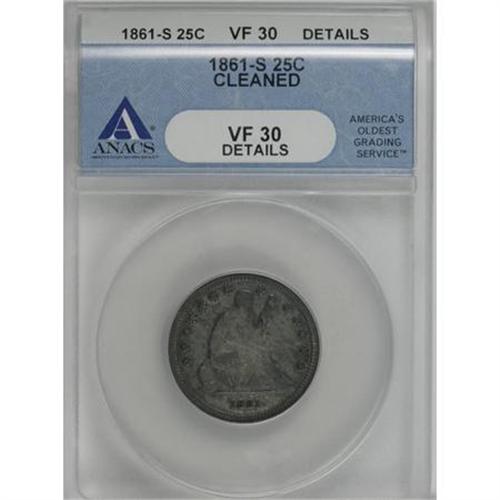 <B>1861-S 25C --Cleaned--ANACS. VF30 Details. </B></I> Moderately worn across both sides, with grayish steel-green coloration and a somewhat muted appearance from harsh cleaning. Surface marks are minimal, and none of them are severe. A scarce and desirable date in any condition, from a scant mintage of 96,000 pieces. <BR><BR><B>Coin Engraver:</B> Christian Gobrecht<BR><BR><b>Shipping:</b> Coins & Currency (<a target="_blank" href="http://www.heritageauctions.com/common/shipping.php">view shipping information</a>)