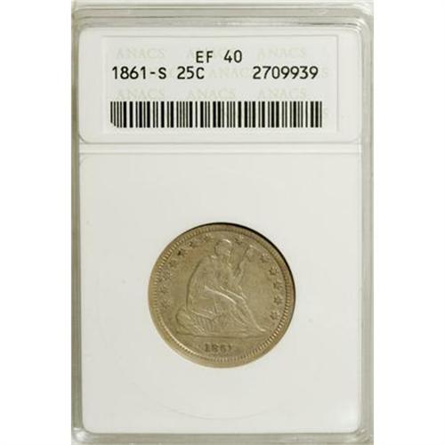 <B>1861-S 25C XF40 ANACS.</B></I> Medium honey-gray toning embraces this lightly abraded rare date Seated quarter. LIBERTY is bold, and traces of luster emerge when the coin is rotated beneath a light. Only 96,000 pieces were struck, and most survivors are well circulated or impaired.<BR><I>Ex: St. Louis Central States Signature (Heritage, 5/05), lot 6864.</B></I><BR><BR><b>Shipping:</b> Coins & Currency (<a target="_blank" href="http://www.heritageauctions.com/common/shipping.php">view shipping information</a>)