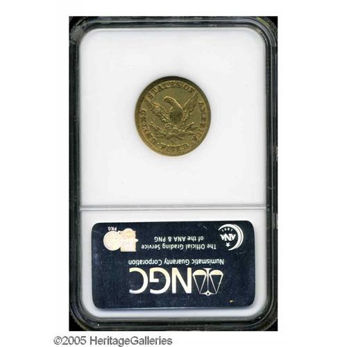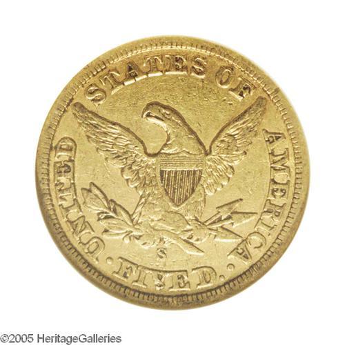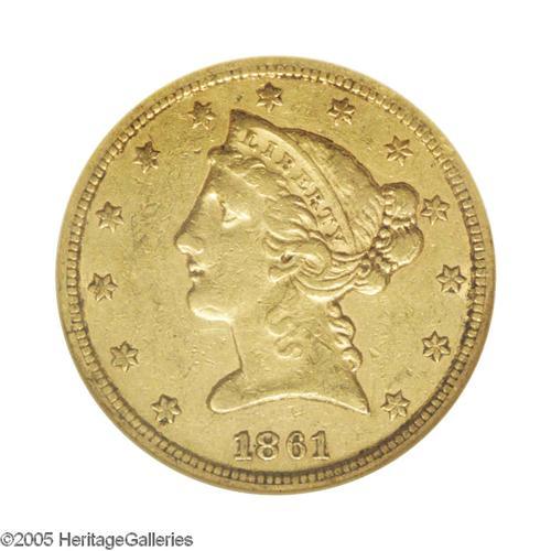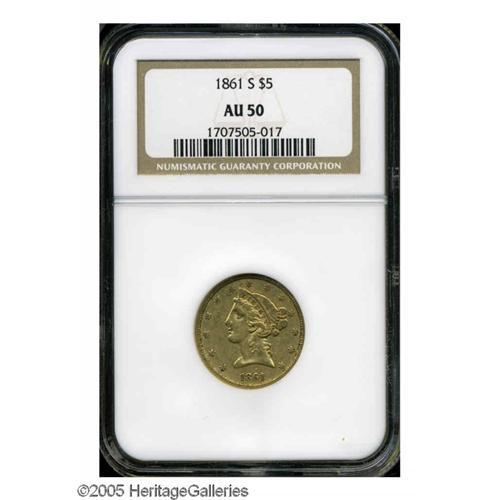<B>1861-S<$5> AU50 NGC.</B></I> The surfaces on this elusive S-mint Five are accented in deep brown patina and are well balanced from side to side. Most of the 18,000 pieces struck circulated for decades and the typical survivor, of which there are surprisingly few, has at least 20 points of wear. Typically marked for the grade.