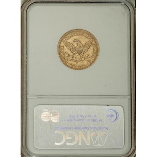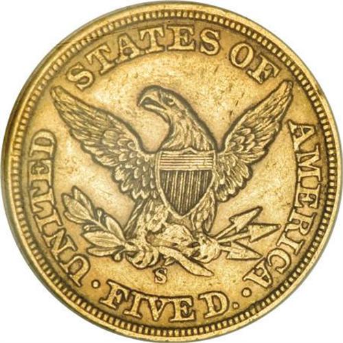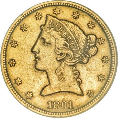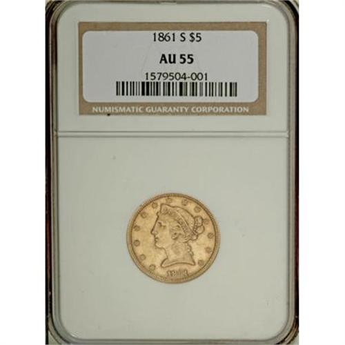 <B>1861-S $5 AU55 NGC.</B></I> Uncommonly solid detail with still-lustrous fields that showcase subtle apricot and mustard-gold shadings. Light but distinct wear visits the highpoints, and the surfaces show scattered marks, including one at the corner of Liberty's mouth. Still, the overall visual appeal remains strong for this elusive San Francisco issue.<BR> Garrett and Guth (2006), discussing the 1861-S in their <I>Encyclopedia of U.S. Gold Coins</B></I>, offer the following comments: "Half eagles were the favored denomination on the West Coast during the early 1860s. Most of the small mintage of 1861-S half eagles was well circulated, and few examples have survived." The appearance of this Choice AU representative should not pass unnoticed. Census: 6 in 55, 8 finer (12/07).<BR><BR><B>Coin Engraver:</B> Christian Gobrecht<BR><BR><b>Shipping:</b> Coins & Currency (<a target="_blank" href="http://www.heritageauctions.com/common/shipping.php">view shipping information</a>)