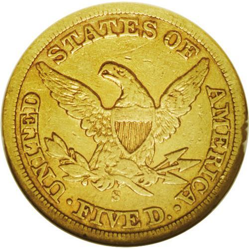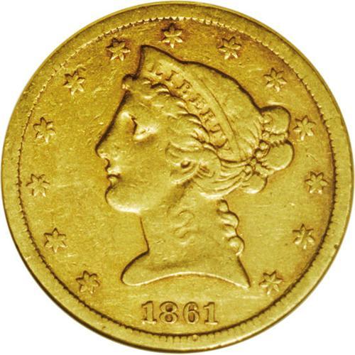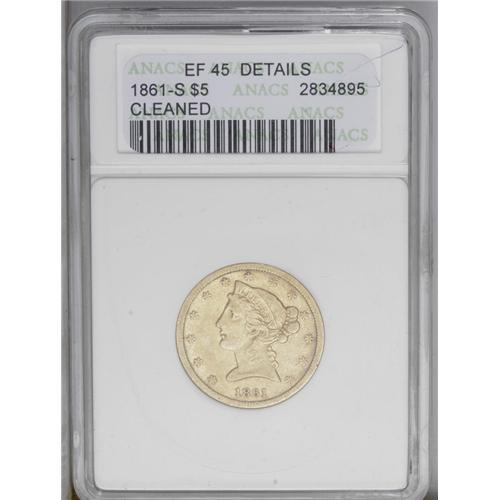 <B>1861-S<$5>--Cleaned--ANACS. XF45 Details.</B></I> Although a few minor hairlines are present on both sides, this is an exceptional example of the date. Most of the 18,000 examples that were struck went immediately into circulation. Today, the majority of survivors are well worn. An attractive example with light yellow-gold coloration and hints of lilac toning. <BR><BR><B>Important notice:</B> Heritage usually auctions material at the rate of 200-250 lots per hour. On some occasions eBay Live bid software or the Internet may not be able to keep up with the pace of the auction. We recommend placing a realistic absentee bid now as insurance to avoid disappointment. Occasionally the auctioneer may eliminate or reject an eBay Live bid, and the auctioneer may also reopen a lot after the close of the eBay live bidding (usually because we missed an audience bid), and may reject your bid even if it shows you as the winning bidder. By bidding via eBay Live, you agree that Heritage may award the lot to another bidder at its sole discretion under the circumstances described above or any other reasonable circumstances. Since eBay bids are not shown to us until we open the lot on the floor, we treat those bids just like floor bids. In most cases the floor responds before the eBay bid is presented to us, due to Internet lag time, so for consistency we have made it a policy that floor bids are always considered first over tie eBay live bids. Also please note that all Heritage lots purchased through eBay Live carry a 20% Buyer's Premium. Please make sure you read the Terms and Conditions before you bid. This lot is being auctioned in conjunction with a live floor auction by Heritage Galleries & Auctioneers. All final auction and invoice information will be supplied by Heritage Galleries & Auctioneers, and all other information should be considered preliminary. Lot:2755 <BR><BR><B>Winning Notification and Billing:</B> After the FINAL session in this auction is complete, Heritage will send e-mail and snail mail invoices. This process normally takes several days. All final auction and invoice information will be supplied by Heritage Galleries & Auctioneers, and all other information should be considered preliminary. <BR><BR>This auction will be conducted on a live auction floor and over the Internet through eBay Live. If you choose to place an absentee bid, please take a moment to <font color='#0000ff'><u><a href='http://pages.ebay.com/liveauctions/help/before/laabsentee.html'>learn how eBay Live absentee bidding works</a></u></font><font color='#000000'>